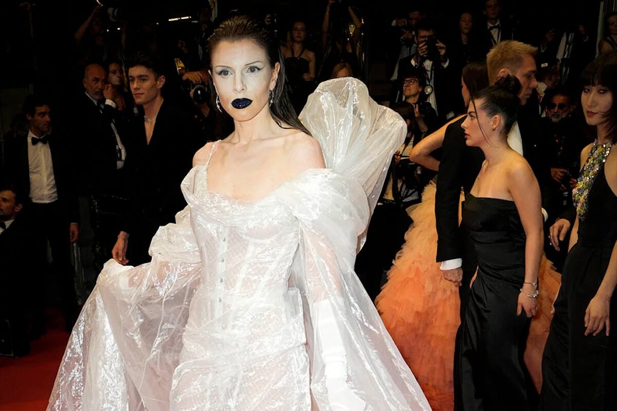 Trước đó, trên thảm đỏ Cannes 2023, Julia Fox cũng diện chiếc váy trễ vai được làm từ nhựa. Lớp nhựa trong để lộ váy lưới cúp ngực phía bên trong.