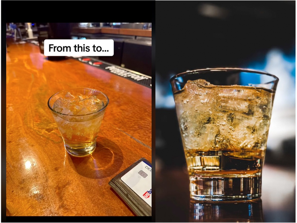 Cụ thể, TikToker lấy ví dụ tình huống chụp hình ly đồ uống đặt trên bàn và minh họa bằng 2 cách chụp cho kết quả hoàn toàn khác nhau. Bí quyết nằm ở thao tác lật ngược iPhone lại để hướng camera xuống phía dưới thay vì nằm ở phía trên như chúng ta thường chụp.
