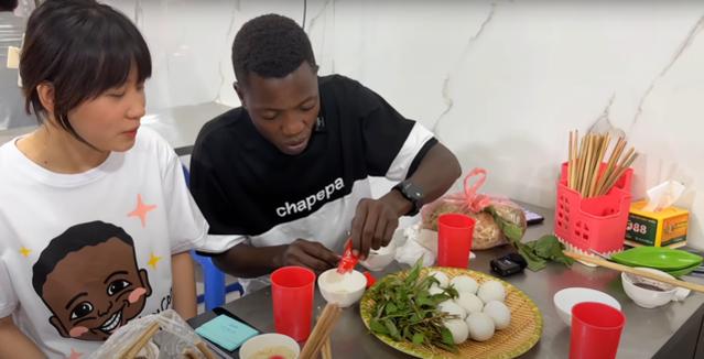 Chàng trai châu Phi ăn 4 quả trứng vịt lộn, phát biểu hài hước khi lần đầu ngồi tàu điện trên cao. Thực khách tới từ châu Phi không nói nên lời trong lần đầu nếm thử trứng vịt lộn Việt Nam, liên tục giơ ngón tay cái giống nút "like" thể hiện sự thích thú.