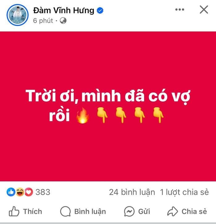 Tối 6/6, Đàm Vĩnh Hưng bất ngờ đăng tải dòng trạng thái “Trời ơi, mình đã có vợ rồi” thu hút nhiều sự chú ý. Khán giả đã để lại lời chúc mừng dành cho nam ca sĩ Đàm Vĩnh Hưng: “Có vợ hơi muộn nha anh yêu”, “Có vợ rồi thì vui lên nhé anh”, “Phải công nhận Đàm Vĩnh Hưng đỉnh của đỉnh”…