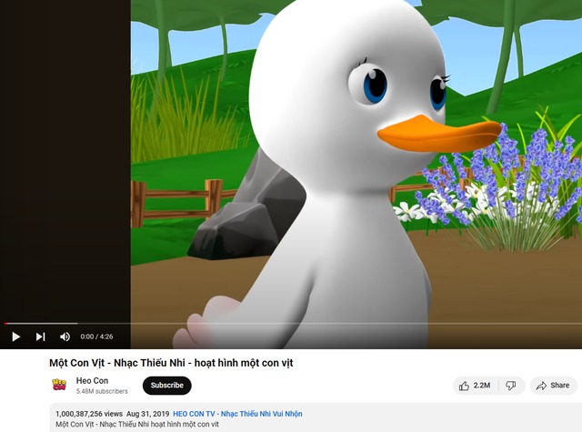 Được biết, kênh YouTube Heo Con, nơi đăng tải MV này, hiện có 5,47 triệu người đăng ký. Ngoài "Một Con Vịt," kênh này còn có nhiều ca khúc thiếu nhi khác thu hút hàng trăm triệu lượt xem, chứng tỏ sức hút mạnh mẽ của nội dung dành cho trẻ em trên các nền tảng số.