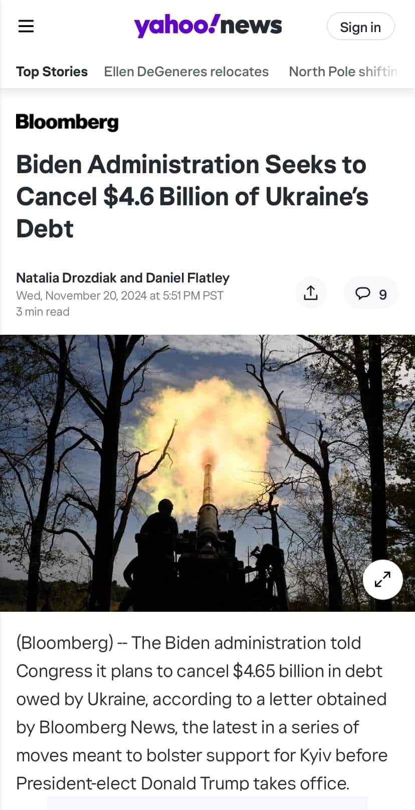 -Nhằm kiếm chút cháo trước khi về vườn. Biden ký lệnh xóa nợ 4.65 tỷ cho Ukraine. Đây là một phần của 9.4 tỷ mà Mỹ cho Ukraine mượn, không dính dáng gì đến hơn 200 tỷ viện trợ cho chiến tranh.