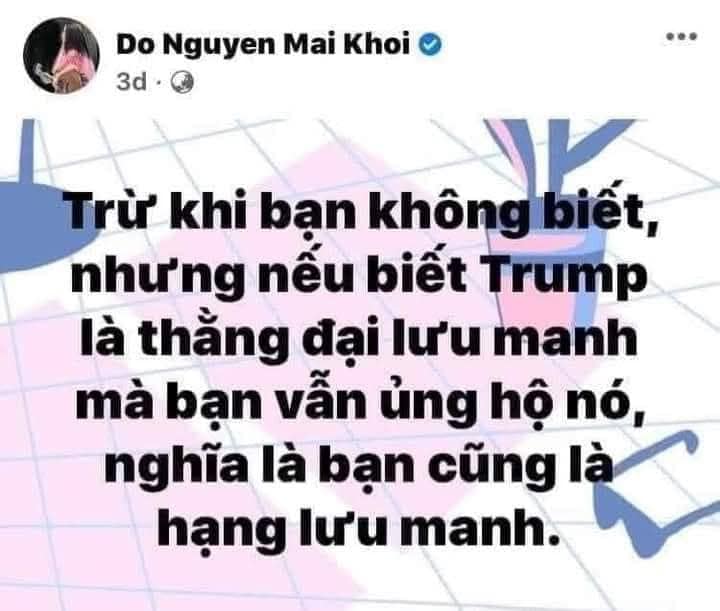 Đối với TT Trump về tiền bạc ông ta không cần vì là một tỉ phú Ngay cả nhiệm kỳ sắp tới ông ta tuyên bố không nhận lương lo cho dân là trên hết.còn chú 7 cứ thế nhận hối lộ từ thằng trung cộng . Còn về ABC bồi thường 15 triệu cũng sẽ tặng lại .ông ta chỉ muốn cái danh dự đã bi phỉ báng .Riêng về các đài thổ tả kể cả SBTN hãy coi chừng tiền đếch đâu mà trả sập tiệm và có thể đếm lịch tam tông miếu