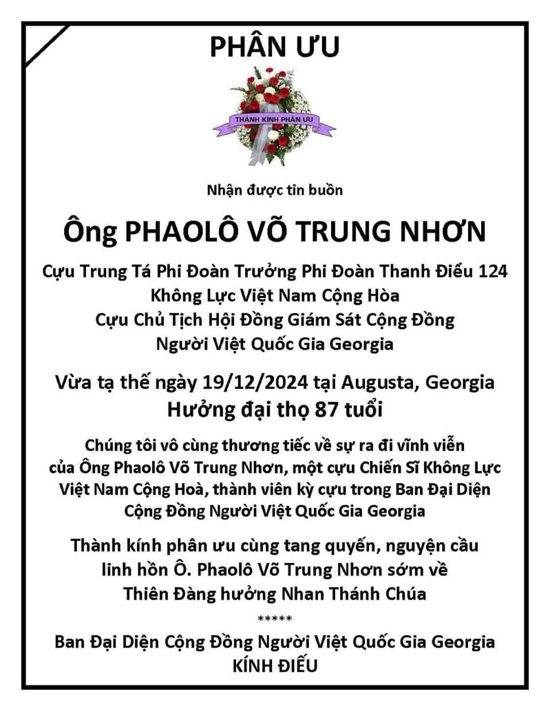 đã đến thăm viếng và đưa tiễn ông Phaolô Võ Trung Nhơn, Cựu Trung tá Không Quân VNCH, Cựu CT Hội Đồng Giám Sát CĐNVQG GA và cũng là Cố vấn cho CĐNVQG Hoa Kỳ về nơi an nghỉ cuối cùng. Sau phần thánh lễ trong nhà thờ là nghi thức phủ cờ VNCH do Liên Hội đảm trách và trao lại cho gia đình ông, lá cờ Tổ Quốc-Danh Dự-Trách Nhiệm mà ông đã phục vụ dưới thời VNCH.