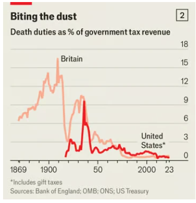 Thuế thừa kế tính theo % tổng thu ngân sách chính phủ. Biểu đồ: The Economist.