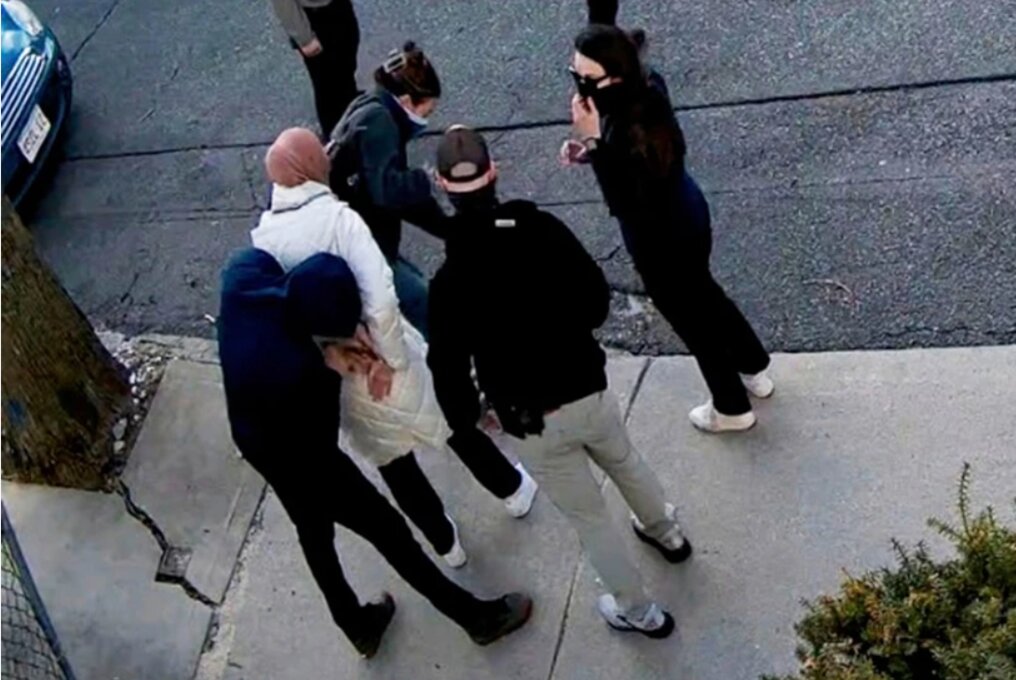 Hình ảnh từ video giám sát cho thấy cô Rumeysa Ozturk (áo khoác trắng) bị nhóm cảnh sát mặc thường phục bắt hôm 25-3. Ảnh: ABC NEWS