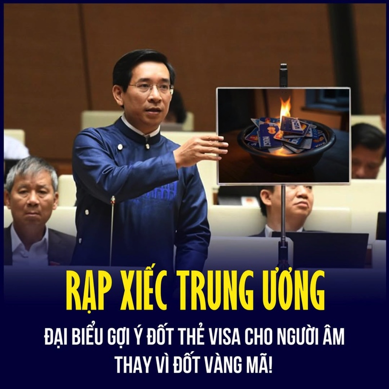 Theo ông đại biểu Nguyễn Văn Cảnh, thay v́ đốt cả cọc tiền vàng gây ô nhiễm, có thể đốt thẻ Visa, Master giá trị vài tỷ đồng cho người âm. Đây là nội dung được bàn thảo về dự thảo Luật Thuế tiêu thụ đặc biệt sửa đổi.