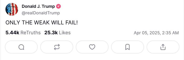 Tổng thống Mỹ Donald Trump vừa động thái bất ngờ giữa bão thuế quan, đăng thông điệp vỏn vẹn 5 chữ, viết in hoa toàn bộ trên nền tảng mạng xã hội Truth Social: “CHỈ KẺ YẾU MỚI THẤT BẠI!”.