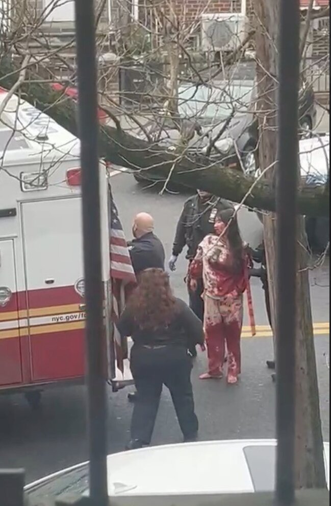 Hình ảnh từ hiện trường được báo New York Post đăng tải cho thấy một bé gái bị thương nặng đứng trước tòa nhà, máu chảy khắp người, trong khi nghi phạm nằm trên cáng cứu thương với vết thương nghiêm trọng.