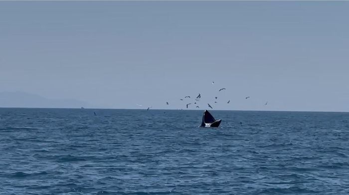 Hình ảnh cá voi há lớn miệng săn mồi sát bờ biển Xuân Thạnh. Ảnh: NEIL NGUYỄN