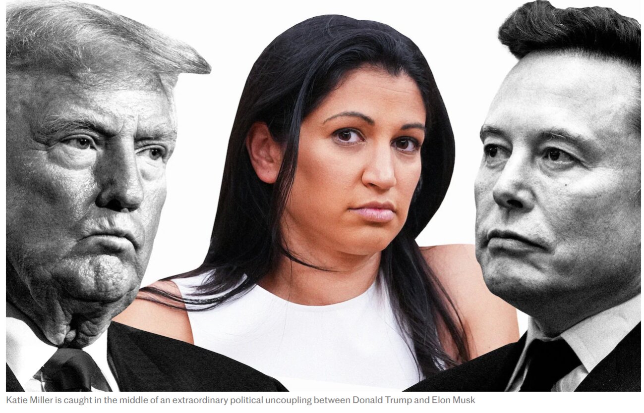 Katie Miller đă có mặt tại Texas vào tuần trước để tham gia loạt bài phỏng vấn Musk với các nhà báo về công nghệ và vũ trụ khi tàu vũ trụ Starship của SpaceX thực hiện chuyến bay thử nghiệm thứ chín. Tại đây, Musk lần đầu tiên bày tỏ một cách tinh tế rằng ông "thất vọng" về dự luật chính sách trong nước của đảng Cộng ḥa trong một cuộc phỏng vấn với CBS News.