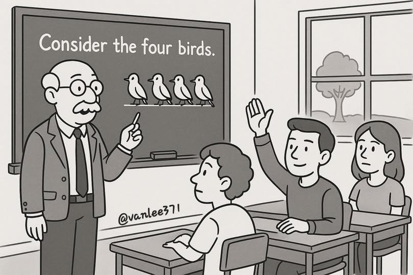 - "Nếu có bốn con chim đậu trên cây và ba con quyết định bay đi, hỏi còn lại bao nhiêu con trên cây?"