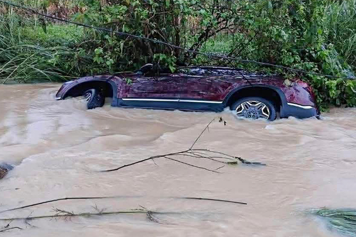 Khi tới km33, đoạn qua thôn 1, chiếc Santa Fe bất ngờ bị nước lũ cuốn trôi. Trên xe lúc này có 5 người, gồm 3 người lớn và 2 trẻ em. Ô tô bị cuốn đi khoảng 200m về phía hạ lưu và chỉ dừng lại khi mắc kẹt ở khu vực bờ tre ven đường.