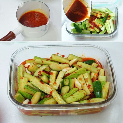 Bạn cho dưa leo đã rửa vào trong chiếc khay hộp có nắp đậy. Tiếp theo, làm nóng chảo, cho dầu vào, tiếp theo cho hỗn hợp gia vị: 1 ½ muỗng canh tương ớt xào, 6 muỗng canh giấm táo, 4 muỗng canh đường nâu, 5 muỗng canh nước, một ít muối vào khuấy tan, đun sôi tắt bếp, để nguội. Bạn đổ hỗn hợp gia vị vào khay dưa leo, cắt tỏi thành những lát mỏng cho vào khay dưa leo trộn đều, đậy nắp để vào ngăn mát tủ lạnh 1 ngày là dùng được.