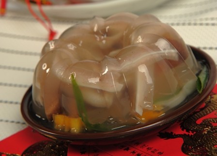Khi ăn, dùng dao khía cạnh bát rồi úp bát thịt đông ra đĩa rồi cắt từng miếng ăn