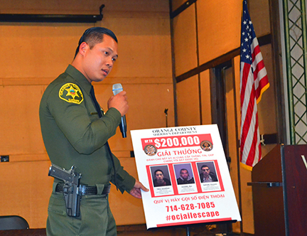 Ông hy vọng với số tiền thưởng lớn như thế, có thể những người nào đang chứa chấp ba tù nhân sẽ sớm cho cơ quan an ninh biết nơi ẩn náu của can phạm. Ông cũng nói rằng những kẻ chứa chấp tội phạm hay giúp tội phạm trốn thoát sẽ bị buộc tội rất nặng. Sau đó, ông nhường lời cho cảnh sát viên Phương Nguyễn thuộc Sở Cảnh Sát Santa Ana nói về lý lịch ba tù nhân (chi tiết này đã được nhật báo Viễn Đông tường thuật trong số báo ra ngày thứ Ba, 26 tháng 1, 2016).