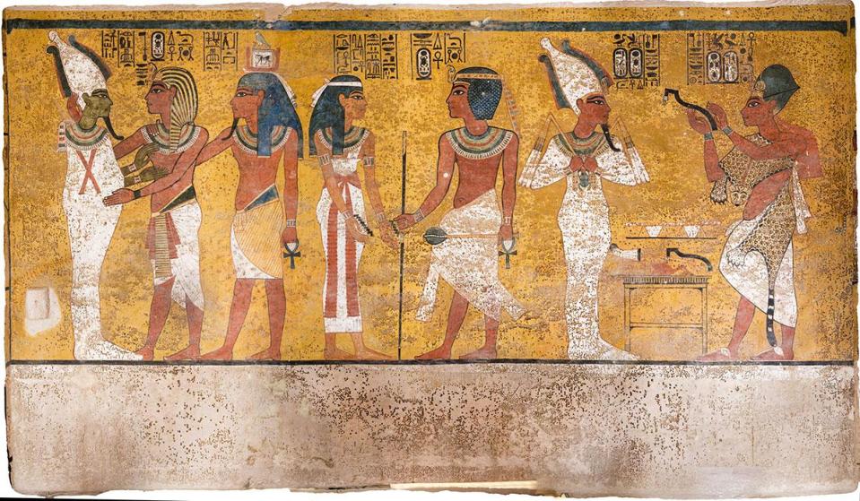 ​​​​​Hình ảnh bên trong lăng mộ vua Tut. Bên cạnh chiếc quan tài bằng vàng nổi tiếng, nơi an nghỉ của vị Pharaoh yểu mệnh còn là di tích khảo cổ quan trọng hàng đầu bởi các bức vẽ trên tường ghi lại hình ảnh cuộc sống cổ đại vẫn còn trong tình trạng tốt sau hàng ngàn năm.