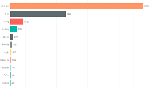 Báo cáo mới nhất của đơn vị chuyên nghiên cứu dữ liệu này cho biết, trong top 10 tỉnh thành có lượng tin rao mua bán nhà đất nhiều nhất 9 tháng qua, TP HCM dẫn đầu, ghi nhận hơn 1,7 triệu tin, tăng gần gấp đôi so với cùng kỳ năm ngoái. Sau điểm nóng TP HCM là Hà Nội ghi nhận hơn 720.000 tin rao, Đà Nẵng xếp thứ ba với 170.000 tin. Bình Dương, Đồng Nai, Khánh Hòa khảo sát được hàng chục nghìn tin. Bà Rịa - Vũng Tàu, Long An, Kiên Giang, Quảng Nam xếp cuối top 10 cũng ghi nhận từ hơn chục đến vài nghìn.