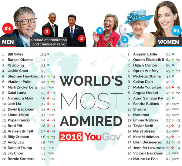 Tiếp đến vào tháng 5.2016, trang tin YouGov công bố kết quả khảo sát về Những nhân vật quyền lực được ngưỡng mộ nhất thế giới năm 2016, trong đó Angelina Jolie đã "đánh bại" Nữ hoàng Anh Elizabeth II, ứng viên Tổng thống Mỹ Hillary Clinton, Đệ nhất phu nhân Mỹ Michlle Obama và các nghệ sĩ tên tuổi khác như Celine Dion, Madonna, Taylor Swift... để trở thành gương mặt đứng đầu trong danh sách này.