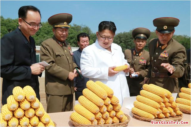Nhà lãnh đạo Kim Jong-un cùng các tướng lĩnh quân đội xem xét các bắp ngô được trồng tại Nông trường số 1116 nằm dưới sự quản lý của Đơn vị 810 thuộc quân đội Triều Tiên. (Ảnh: Reuters)