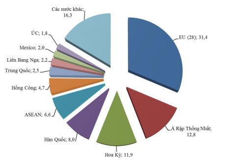 Cơ cấu thị trường xuất khẩu điện thoại và linh kiện của Việt Nam 8 tháng đầu năm 2016.