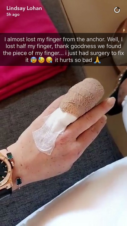 Trên Snapchat, Lindsay đăng video hình ảnh ngón tay được nối lại và băng bó hoàn chỉnh. Cô viết: “Tôi suýt nữa thì mất ngón tay vì cái mỏ neo. Thực ra tôi bị đứt một nửa ngón, ơn trời là chúng tôi đã tìm thấy nửa bị đứt và tôi đã phẫu thuật để nối. Đau lắm! Tội nghiệp ngón tay của tôi”.