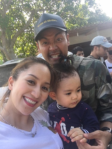 MC Phan Anh chụp ảnh cùng mẹ con Khánh Thi trong chuyến đi trao quà cho đồng bào miền Trung sau trận lụt.