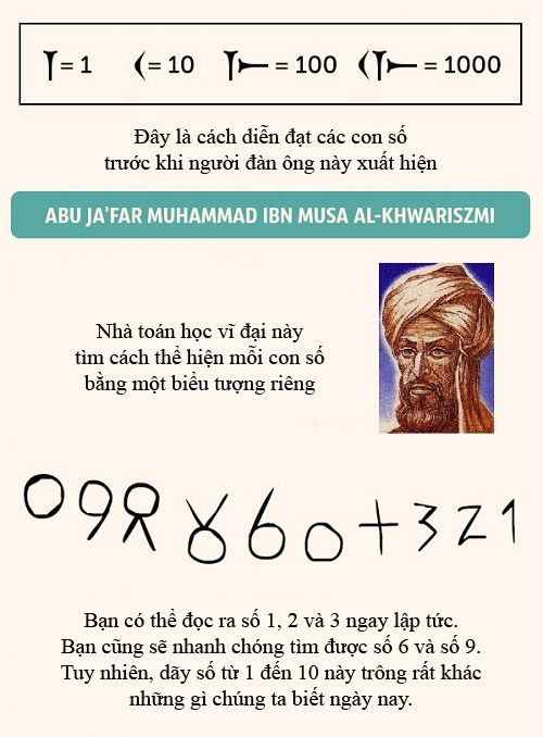 Có bao giờ bạn băn khoăn vì sao lại có con số hiện đại như chúng ta viết ngày nay không? Đó là cả một quá trình và có sự cống hiến không hề nhỏ của một nhà toán học có tên Abu Ja'far Muhammad Ibn Musa Al-khwarismi. Thật hứng thú khi tìm hiểu về nguồn gốc hình thành con số phải không nào?
