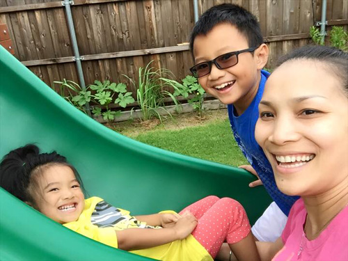 Ba mẹ con Hồng Ngọc thích thú chơi ở khu sân sau nhà