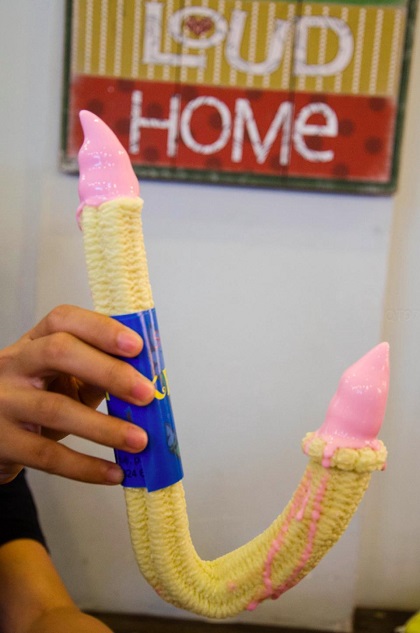 Cây kem có hình chiếc cán ô, với hai đầu là kem tươi mát lạnh, đủ vị như trà xanh, khoai môn, chocolate… và phải ăn thật nhanh vì kem tươi dễ chảy. Vỏ bánh xốp giòn là điểm cộng của món này. Kem gậy Hàn Quốc bán dọc khu ẩm thực phố đi bộ với giá 40.000 đồng một cây. Ảnh: Anh Bùi.