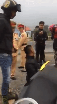 Sau khi các chiến sĩ CSGT giải thích và một lần nữa yêu cầu chàng phượt thủ xuất trình giấy tờ, thì anh ta bất ngờ quỳ xuống rồi xuất trình từng loại giấy tờ một mà không đưa luôn một lần.