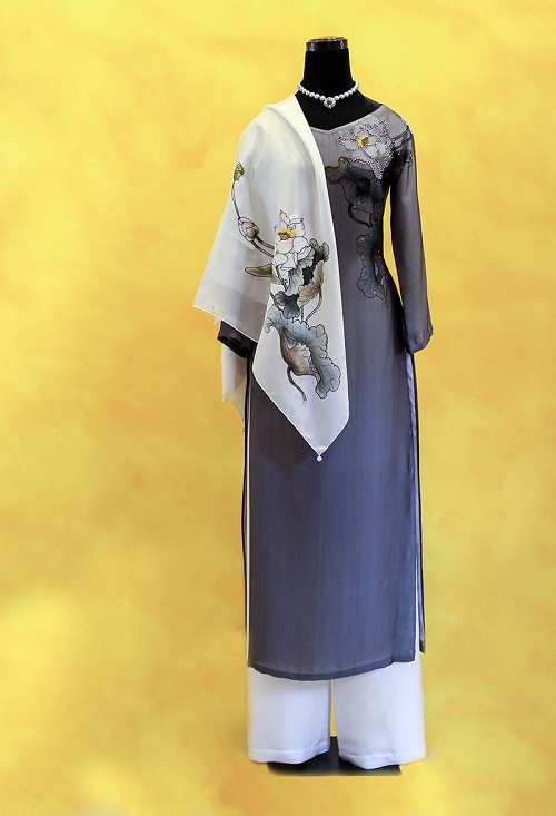 Bộ áo dài tông xám,họa tiết hoa sen vẽ tay tỉ mỉ là món quà Việt Nam gửi tặng bà Michelle Obama - phu nhân Tổng thống Obama. Đây là tác phẩm của NTK Sỹ Hoàng. Ảnh: **********
