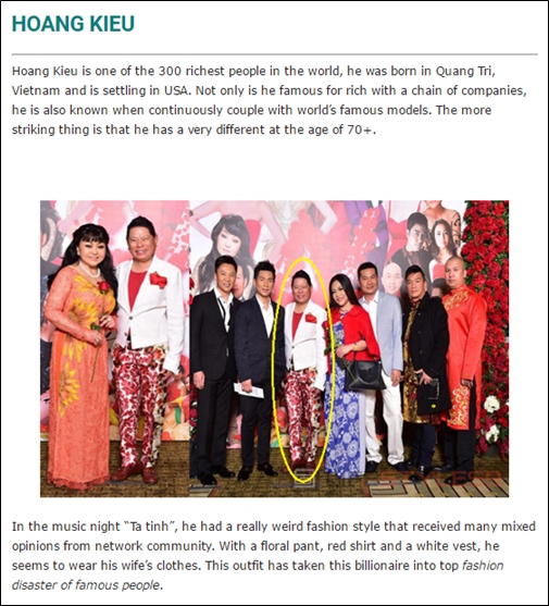 Bài báo viết Hoàng Kiều là 1 trong 300 người giàu nhất thế giới, được biết đến 1 phần nhờ những mối tình với các mỹ nhân nổi tiếng. Trong đêm nhạc “Tạ tình”, ông đã diện lên mình 1 phong cách thời trang “dị hợm”, “trông chẳng khác gì mượn tạm xiêm y của vợ” – đây cũng chính là bình luận mà nhiều dân mạng hài hước cho rằng Hoàng Kiều… mượn đồ của Ngọc Trinh.