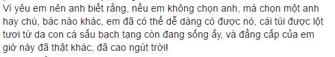 Nhiều người đến bây giờ mới dần nhận ra rằng status của Hoàng Bách muốn ám chỉ điều gì. Anh nói thêm: "Vì anh chợt nhận ra rằng, giá trị và đẳng cấp của 1 người con gái là phải phụ thuộc vào cái túi ấy, không thể khác được!Vì yêu em nên anh biết rằng, nếu em không chọn anh, mà chọn một anh hay chú, bác nào khác, em đã có thể dễ dàng có được nó, cái túi được lột tươi từ da con cá sấu bạch tạng còn đang sống ấy, và đẳng cấp của em giờ này đã thật khác, đã cao ngút trời!".