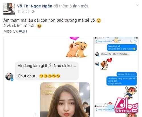 Tin đồn về chuyện tình cảm với ca sĩ Lương Bằng Quang vẫn chưa hết nóng thì mới đây, Ngân 98 lại chia sẻ một dòng trạng thái với những bức hình chụp lại cuộc trò chuyện của mình với một người đàn ông bằng những từ ngữ vô cùng tình cảm, ngọt ngào. Không những vậy cô nàng còn viết dòng caption ngọt ngào: ” Âm thầm mà lâu dài còn hơn phô trương mà dễ vỡ. 2 vk ck tui trẻ trâu. Miss Ck #QH” như để khoe với mọi người niềm hạnh phúc cô đang có bên người tình bí ẩn. Cả hai xưng hô với nhau là vợ chồng vô cùng tình cảm và ngọt ngào.