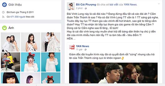 Trên trang cá nhân của mình, nữ nghệ sĩ hài Cát Phượng đã dẫn lại một bài báo nói về việc Trấn Thành bị cấm lên sóng đài TH Vĩnh Long, đồng thời chị tỏ ra rất bức xúc trước quyết định này. Cát Phượng viết: