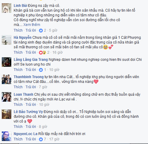 Thấy Cát Phượng nói vậy, nhiều người tỏ ra hoang mang bởi cô vẫn được khán giả yêu mến, hơn nữa chuyện tình cảm trước đó cũng suôn sẻ. Mọi người vẫn không quên động viên nữ nghệ sĩ hài hãy suy nghĩ tích cực lên!