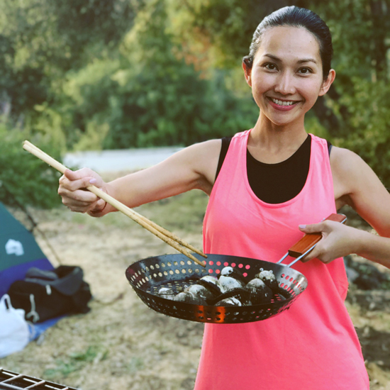 Sau khi công việc dựng lều hoàn tất, Kim Hiền bận rộn nấu bữa ăn tối cho cả nhà.