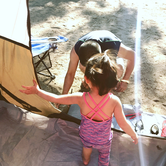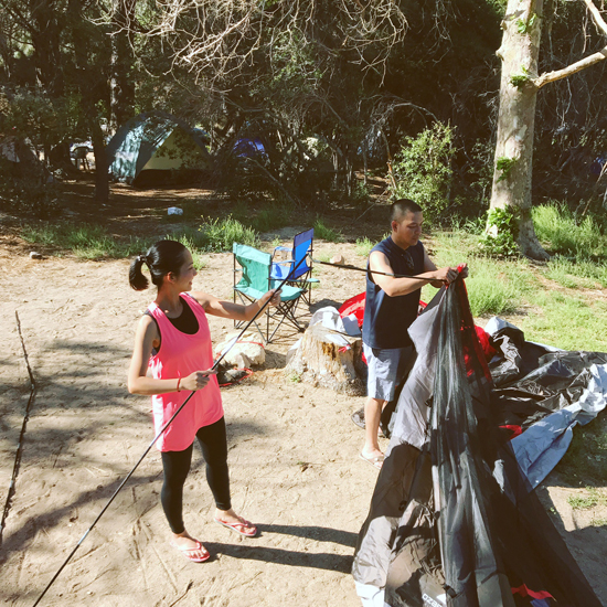 Kim Hiền và ông xã tất bật dựng lều để ngủ qua đêm.