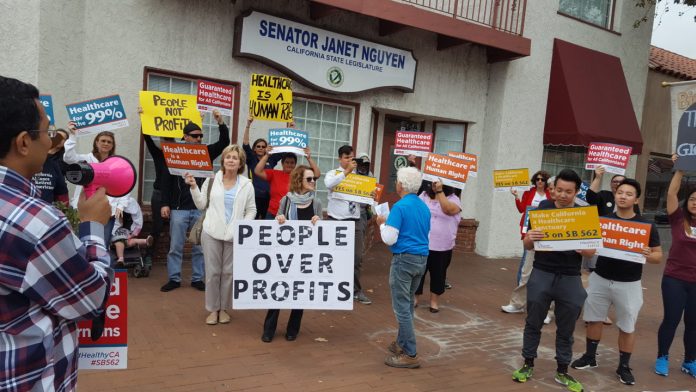 Một nhóm người, cả gốc Việt lẫn da trắng, tập trung trước cửa văn phòng Thượng Nghị Sĩ Janet Nguyễn tại Garden Grove và hô hào khẩu hiệu ủng hộ Dự Luật SB 562, một dự luật y tế toàn tiểu bang, lúc 12 giờ, Thứ Tư, 31 Tháng Năm, và kêu gọi vị nữ dân cử bỏ phiếu