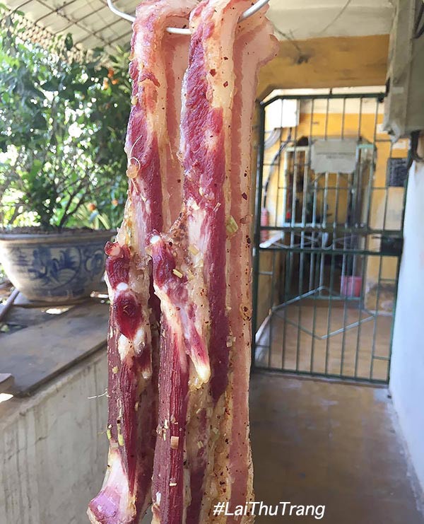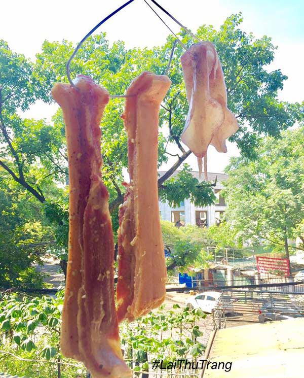 Ướp thịt 5 phút xong treo lên phơi ngoài nắng trong 6 tiếng đồng hồ hoặc đến khi đạt độ ’chín’ ưng ý.