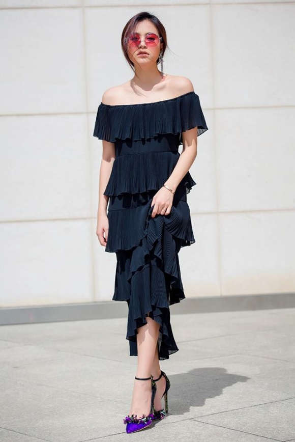 Cô nàng chọn đầm đen vai trễ hòng khoe được bờ vai trắng ngần, nõn nà