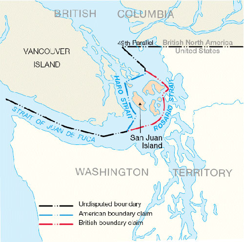 Đảo San Juan nằm trên vùng biển giữa Canada và vùng lãnh thổ Oregon của Mỹ. Cả Anh và Mỹ đều tuyên bố chủ quyền với đảo này, hai bên cho người đến định cư và đồng ý cùng kiểm soát đảo cho đến khi tranh chấp được giải quyết.