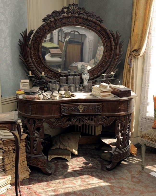 Chiếc bàn trang điểm đứng đó như thể nó đang đợi sự trở lại của chủ nhân. Chổi lông, đồ trang điểm và các lọ nước hoa được bày khắp bàn.