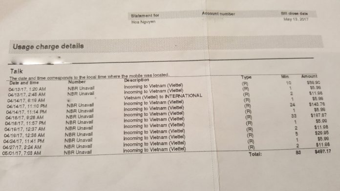 Nhận được hóa đơn điện thoại Tháng Năm, 2017, với số tiền tăng thêm hơn $500 so với mức bình thường, ông Hòa Nguyễn muốn “té xỉu.”