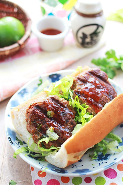 - Bánh mỳ khứa đôi, kẹp thịt bò, rau sống và rưới nước sốt cay ngọt, ăn ngay.