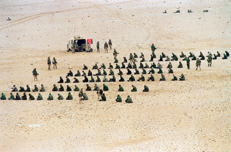 Lính Iraq bị bắt ở giữa sa mạc, xung quanh là lính Mỹ canh chừng.