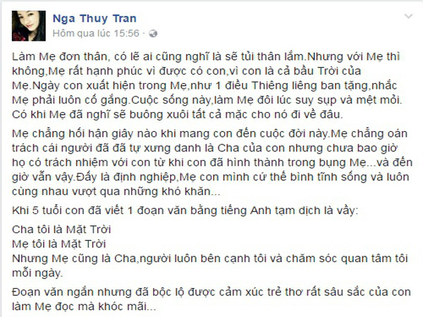"Mẹ chẳng hối hận giây nào khi mang con đến cuộc đời này. chẳng oán trách cái người đã tự xưng danh là cha của con nhưng chưa bao giờ có trách nhiệm với con, từ khi con hình thành trong bụng mẹ. Và đến bây giờ cũng vẫn vậy. Đấy là định nghiệp và mẹ con mình cứ bình tĩnh sống, cùng nhau vượt qua khó khăn", Thúy Nga trải lòng.