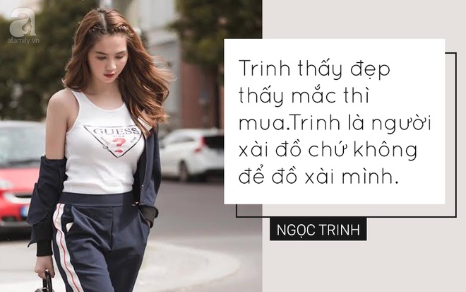 Ngọc Trinh từng nói: "Trinh ngu nhưng Trinh giỏi kiếm tiền". Đúng là Trinh giỏi thật, vừa giỏi kiếm tiền vừa giỏi tiêu tiền, cứ nhìn tủ đồ hiệu của cô là biết ngay cô mê đồ hiệu thế nào, đầu tư chúng ra làm sao, và thu nhập cũng phải "khủng" thế nào thì mới vung tay được như vậy chứ. Nói về Ngọc Trinh, nhất là về sở thích hàng hiệu của cô, nói hoài nói mãi cũng không hết cái để nói. Hết liệt kê đồ hiệu, rồi soi giá tiền lại đến những phát ngôn ngắn gọn súc tích nhưng đúng chất phô trương khiến cả Vbiz phải dậy sóng.