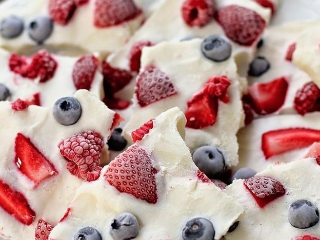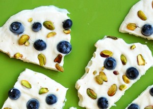 - Xếp trái cây lên trên rồi đặt khay vào ngăn đá ít nhất 4 tiếng tới khi sữa chua đông cứng lại.